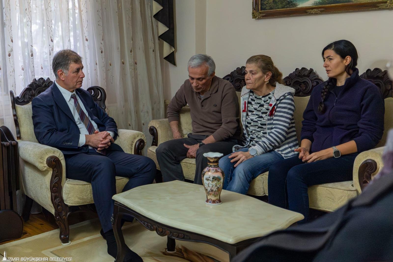 İzmir Büyükşehir Belediye Başkanı Dr. Cemil Tugay, Şehit İbrahim Bolat’ın önce annesi Şehriban Bolat ile babası Yusuf Bolat, sonrasında ise eşi Ayşe Nilay Bolat ile kızı Nil Bolat’a taziye ziyaretinde bulundu. Başkan Tugay’a, İzmir Büyükşehir Belediye Meclisi Divan Katibi Mustafa Vatansever, İzmir Büyükşehir Belediyesi Genel Sekreter Yardımcısı İsmail Mutaf, Destek Hizmetleri Dairesi Başkanı Kazım Kaya ve bürokratlar eşlik etti.
