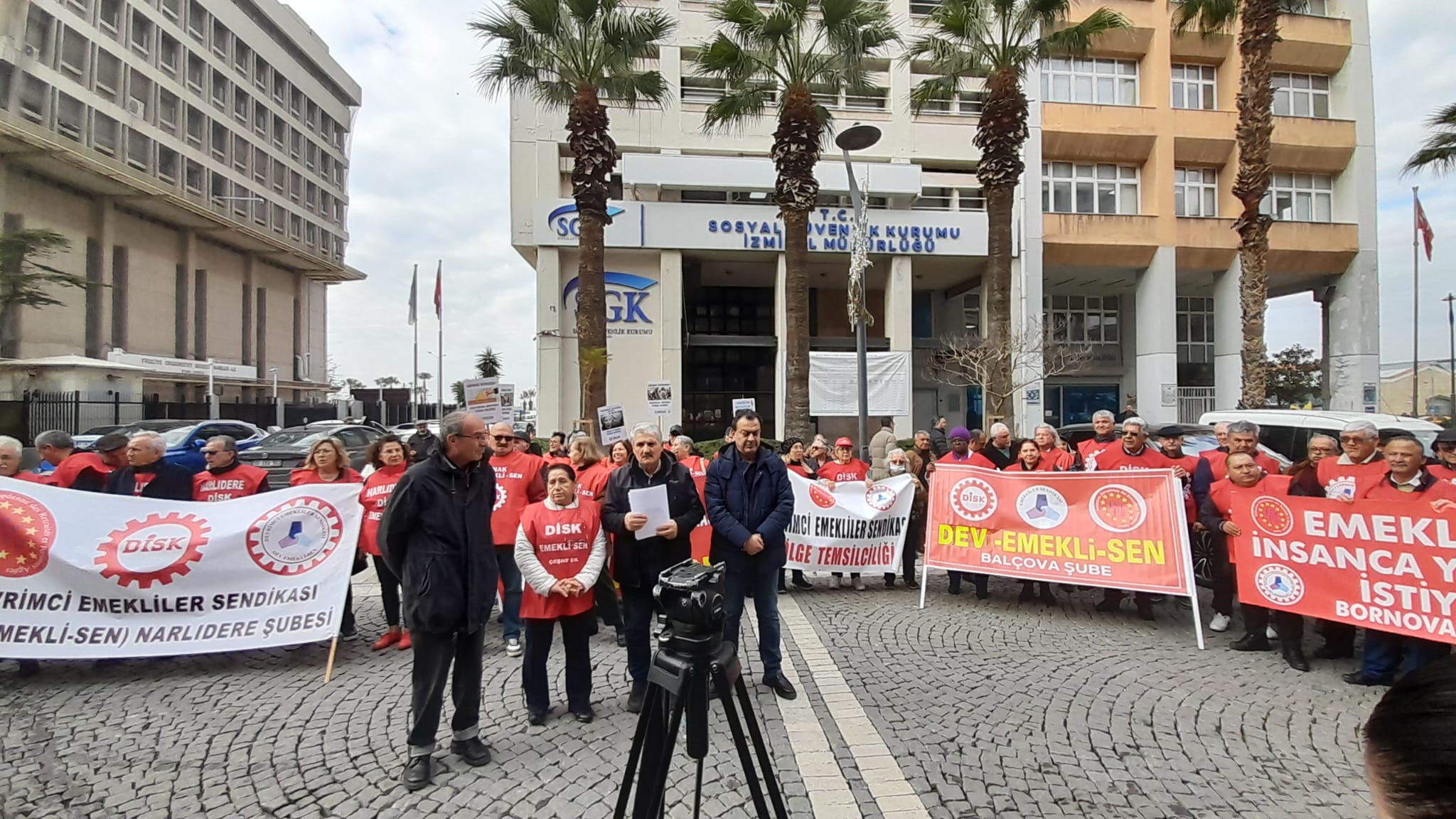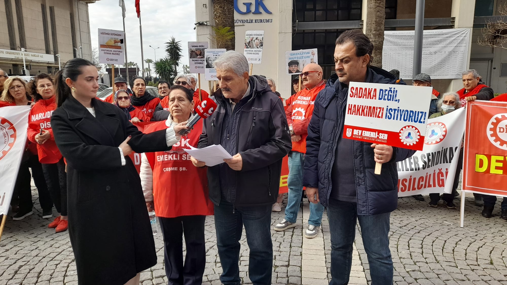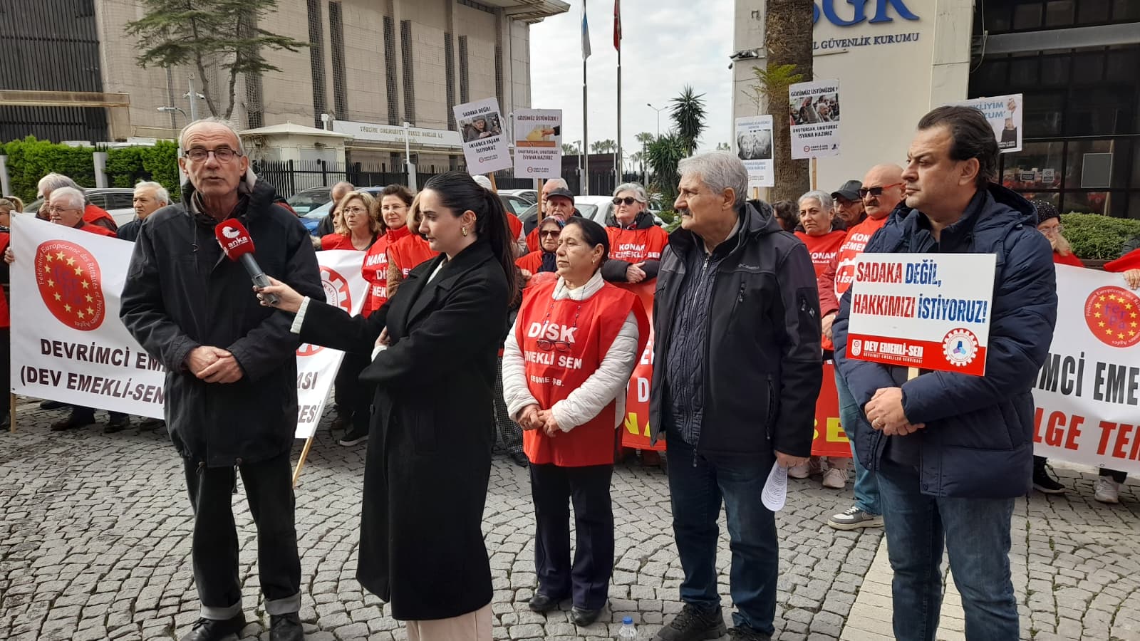 DİSK’e bağlı Devrimci Emekliler Sendikası İzmir şubelerinin yönetici ve üyeleri Konak’ta bulunan SGK’nın önünde iktidara seslendiler.
