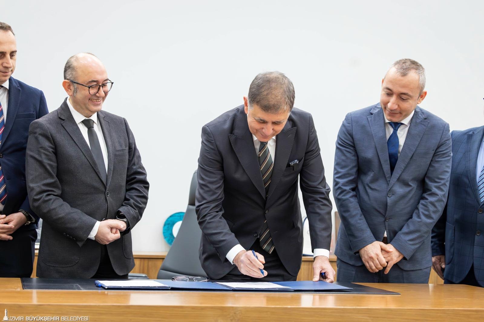 İzmir Büyükşehir Belediye Başkanı Dr. Cemil Tugay, açık ofisteki makamında yapı için hazırlanan ruhsat belgesini imzaladı. Kent için tarihi bir imza atan Başkan Dr. Tugay’a; İzmir Büyükşehir Belediyesi Genel Sekreteri Zeki Yıldırım, Genel Sekreter Yardımcıları Hakan Uzun ve İsmail Mutaf ile Etüt ve Projeler Dairesi Başkanı Selin Zağpus Yiğitoğlu ve Yapı Kontrol Dairesi Başkanı Seha Özmen eşlik etti.