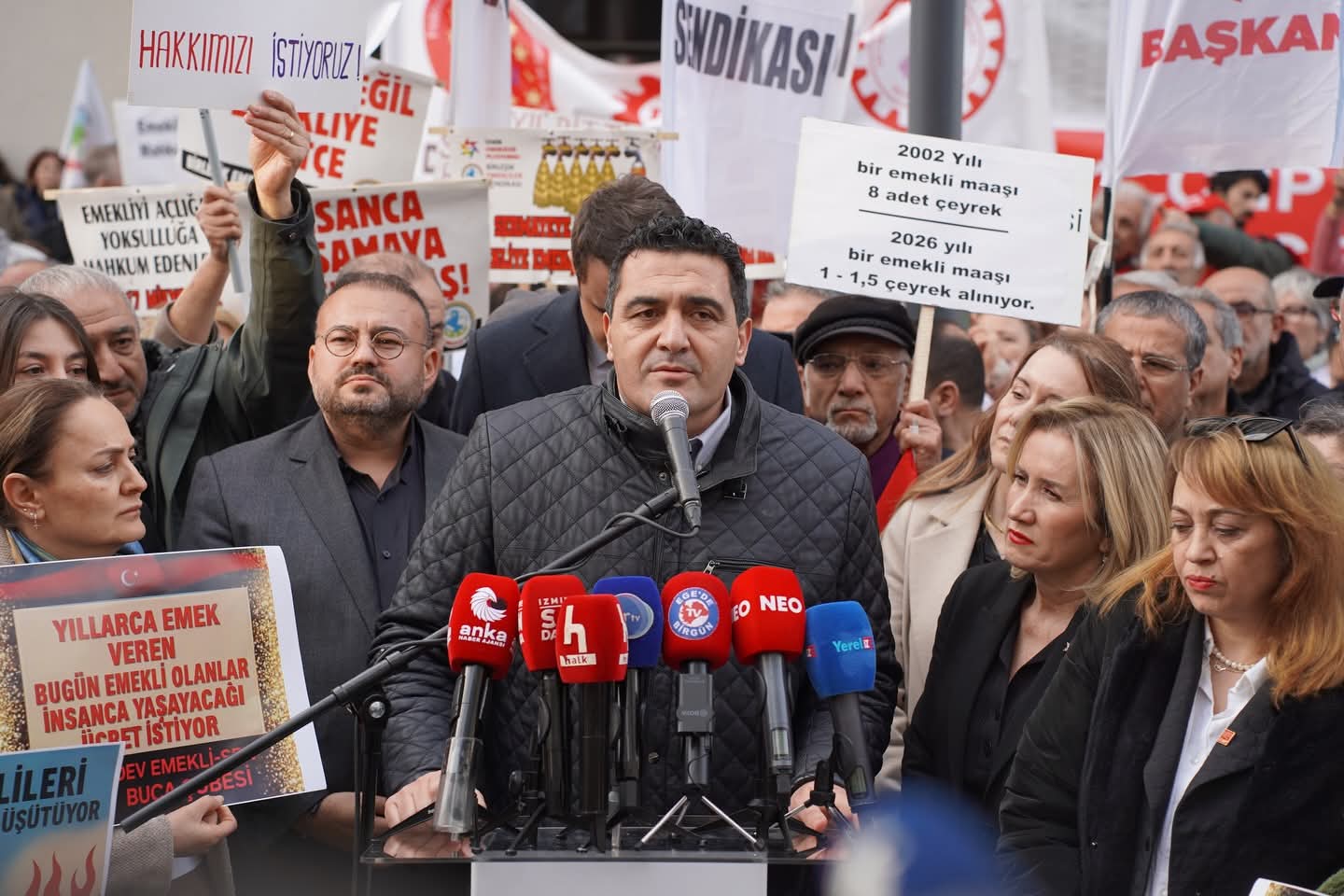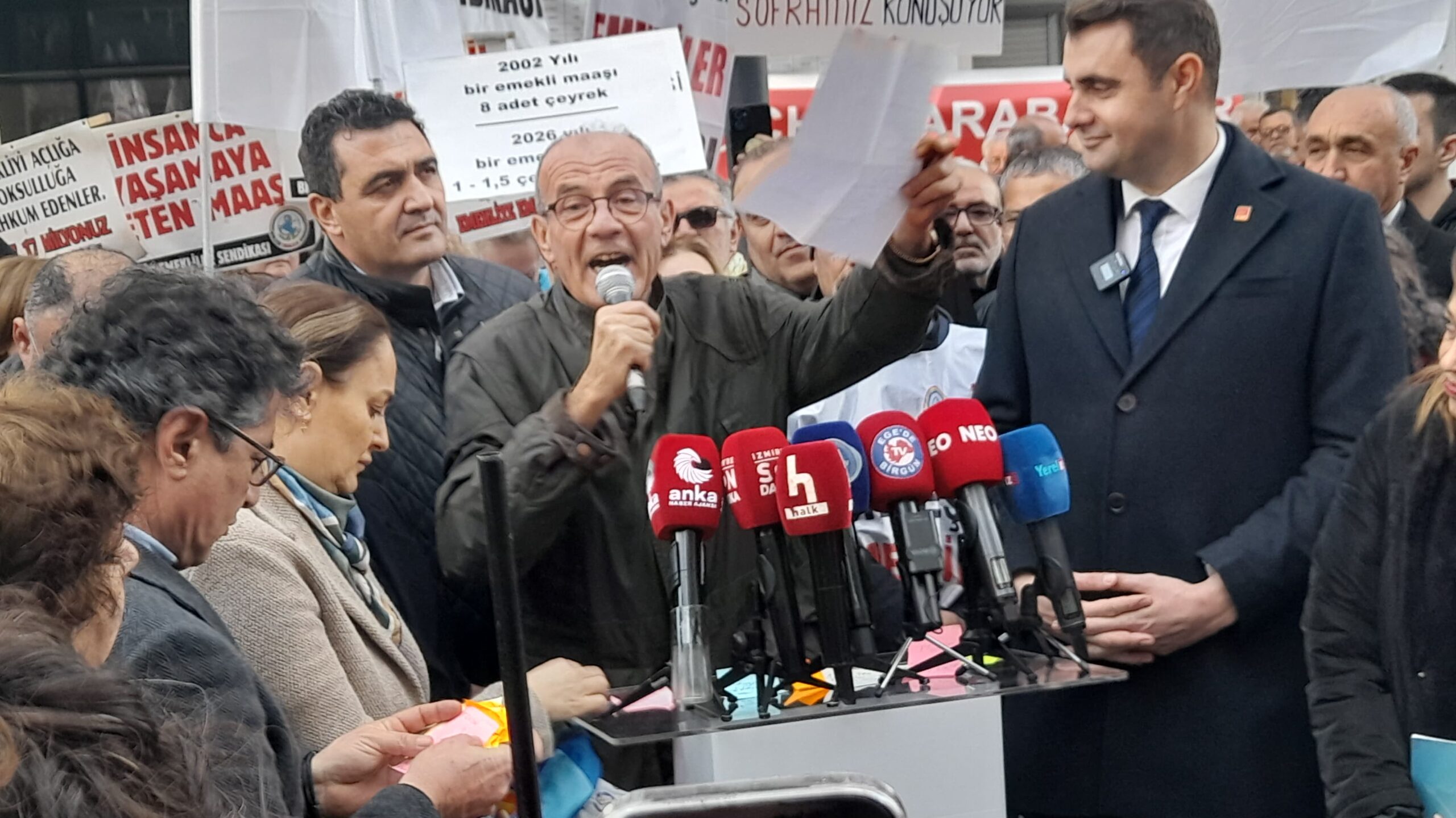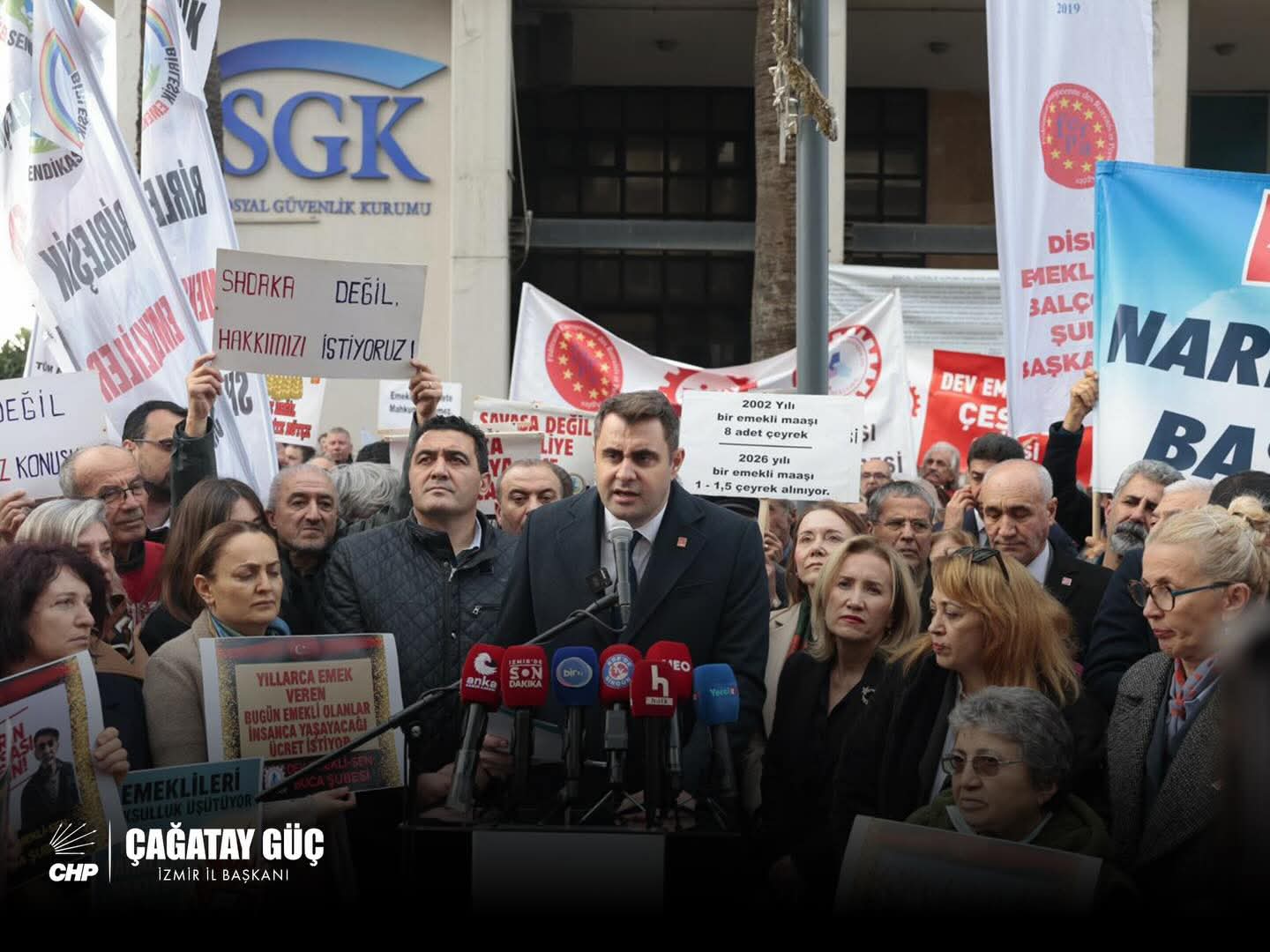 CHP İzmir İl Başkanı Çağatay Güç’ün öncülüğünde düzenlenen “Emekli hakları” ile ilgili basın açıklamasına yoğun olarak katılan emekliler iktidara seslendi: “haklarımızı istiyoruz”