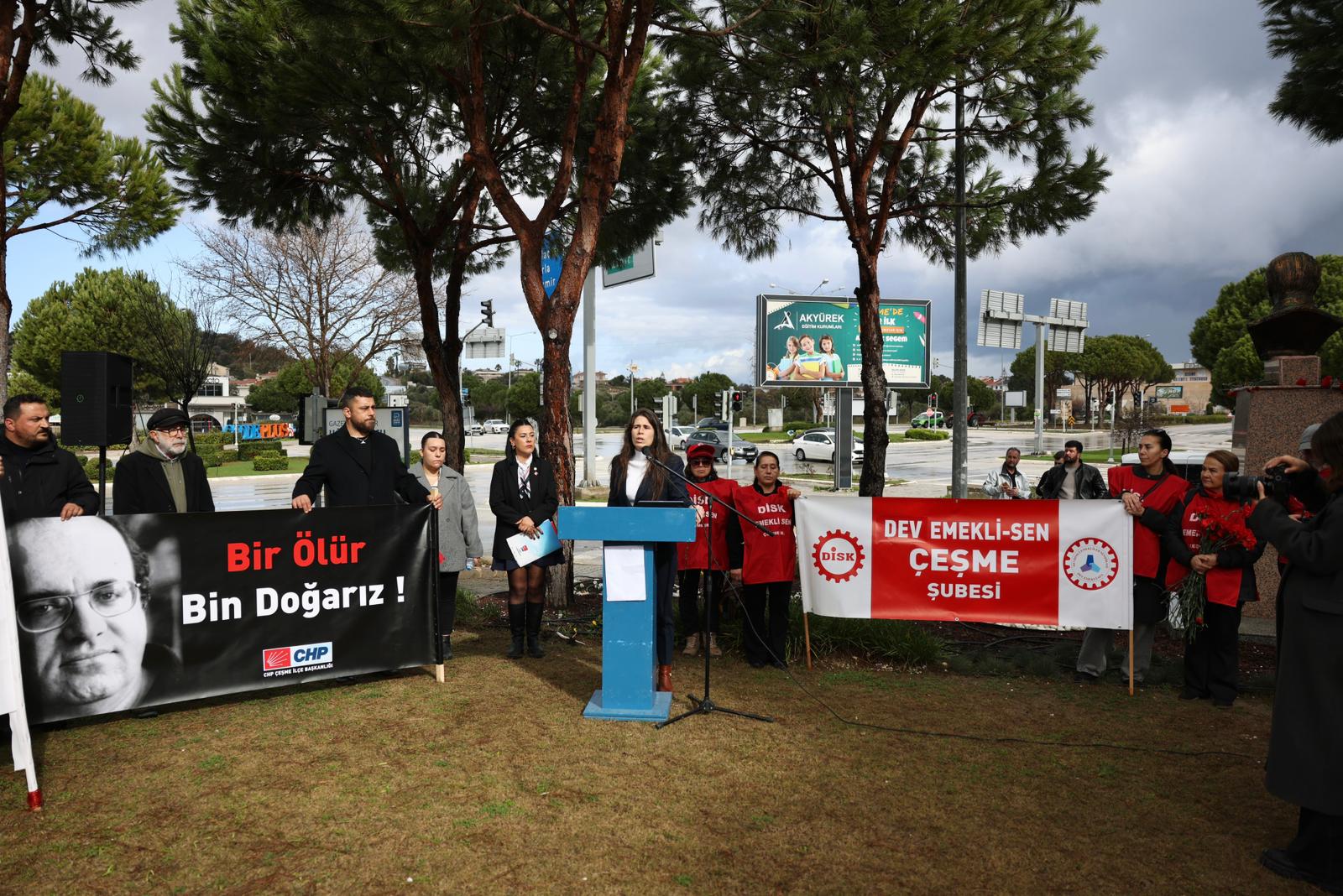 CHP Çeşme İlçe Başkanı Dolunay Onur da konuşmasında, 24 Ocak 1993’te susturulmak istenenin yalnızca Uğur Mumcu değil, toplumun vicdanı olduğunu söyledi.